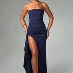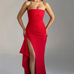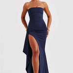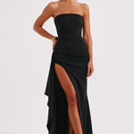 Rochia Maxi Fallon este realizată dintr-un crep dublu elastic de lux care se mulează pe formele tale pentru o potrivire perfectă, care îți conturează silueta. Cu un decolteu fără bretele, detalii dramatice pliate și o fanta până la coapsă cu un volan fluid, această piesă uimitoare este creată pentru a atrage atenția. Perfectă pentru evenimente formale, seri de gală sau nopți de neuitat.
