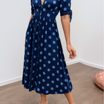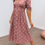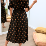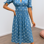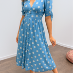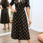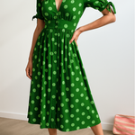 • Clasic se Întâlnește cu Contemporan: Modelul îndrăzneț cu puncte polka aduce o notă jucăușă, retro, în timp ce talia ajustată și partea din față cu nasturi mențin aspectul proaspăt și flatant.