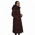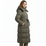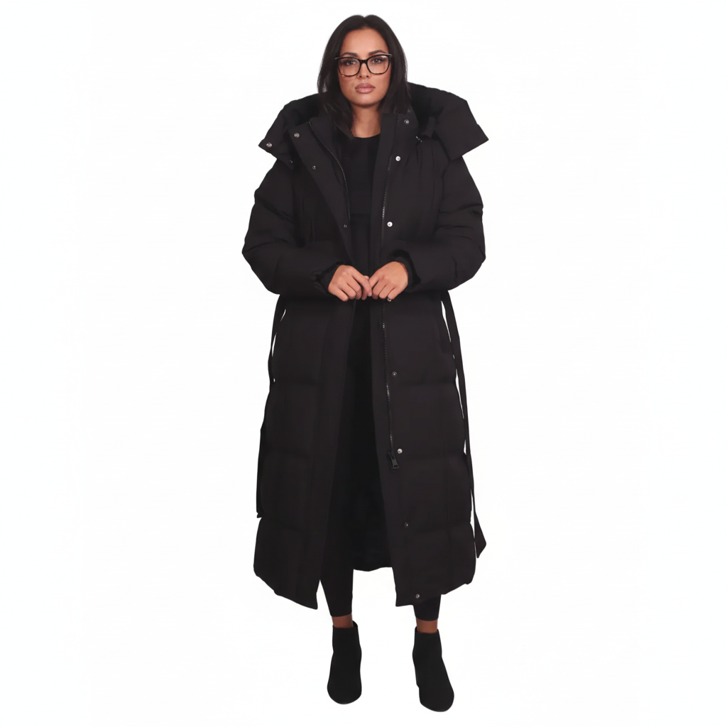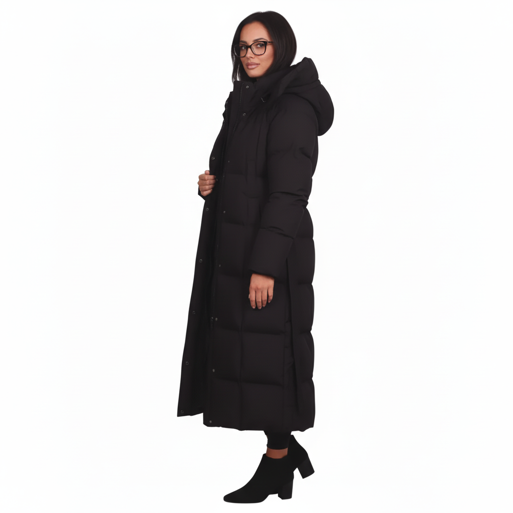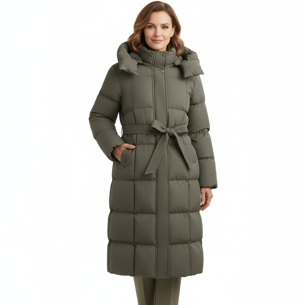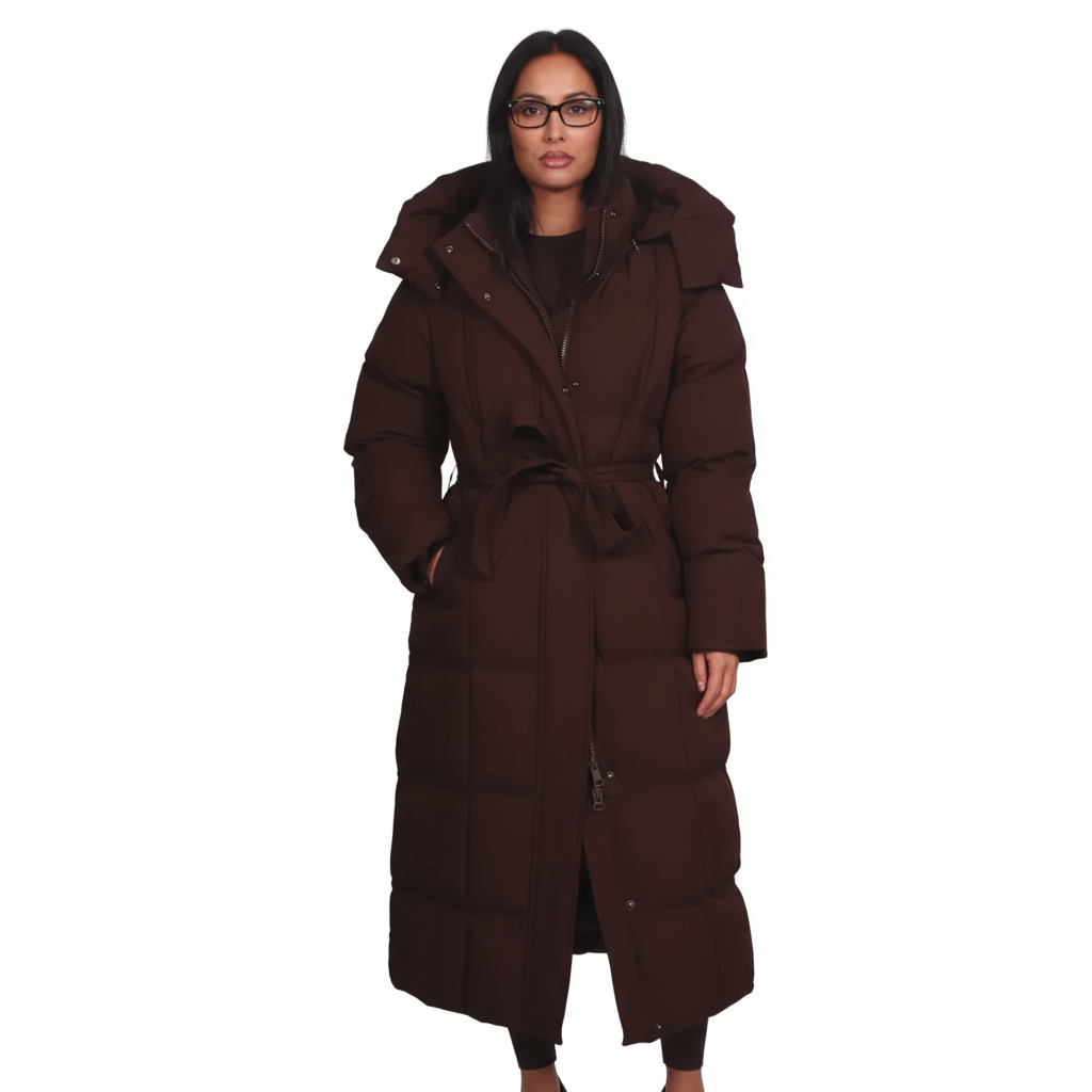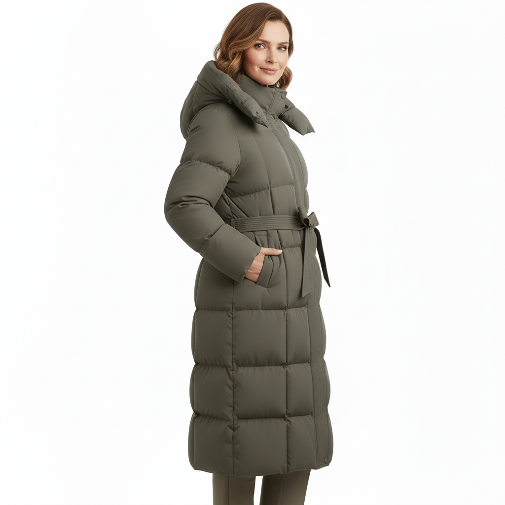 Un palton lung, matlasat, creat pentru zilele reci, cu o croială feminină și un cordon ce evidențiază talia. Gluga generoasă și matlasarea premium îl transformă în alegerea perfectă pentru iarnă.