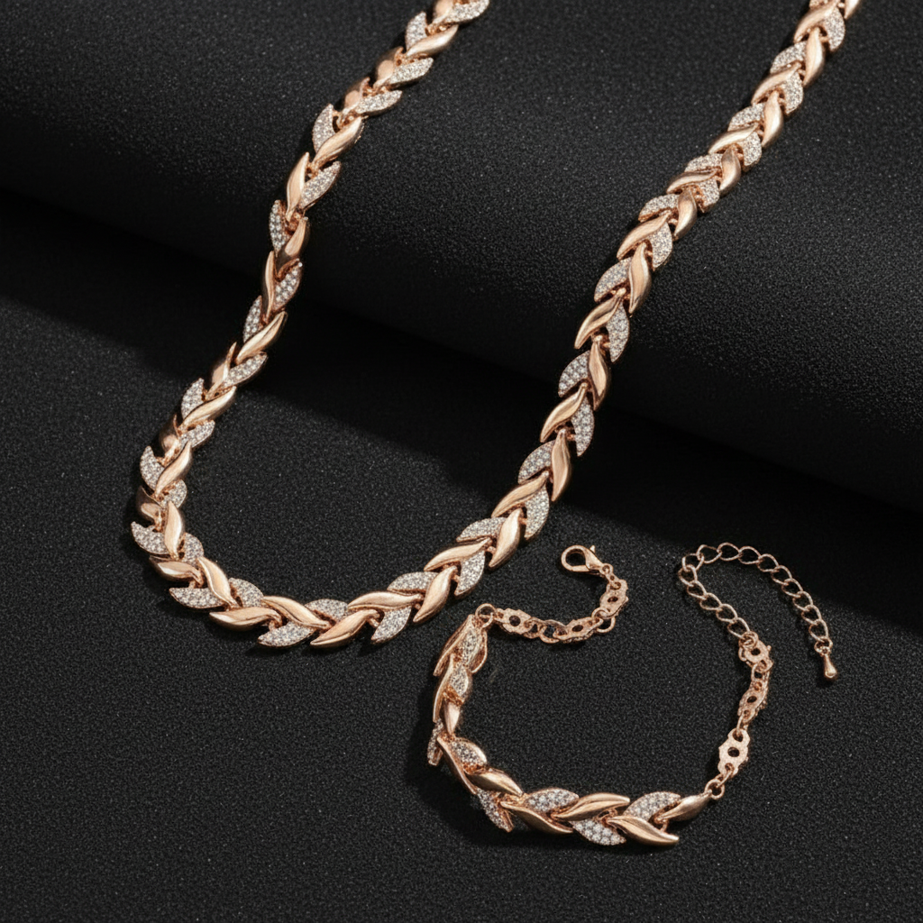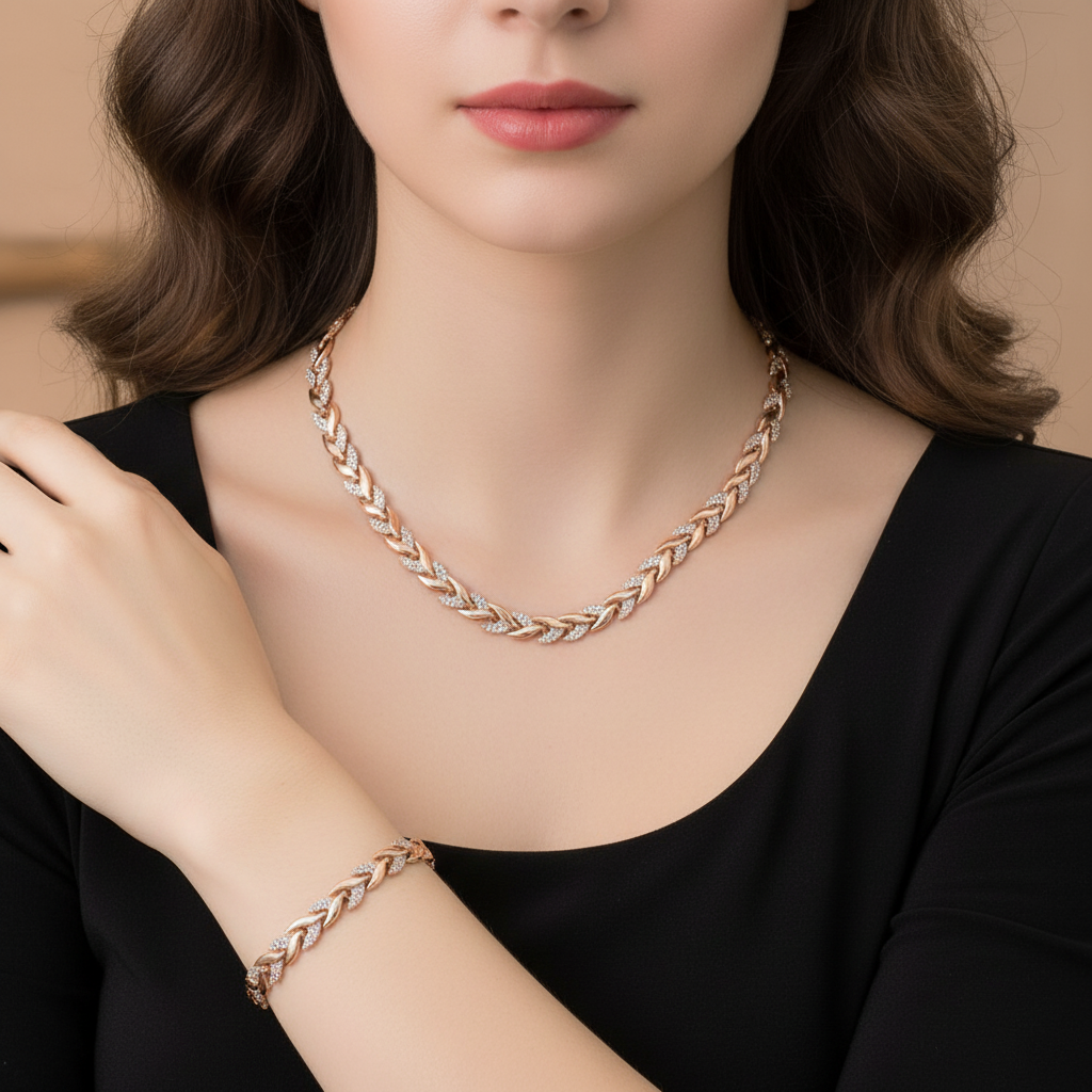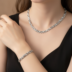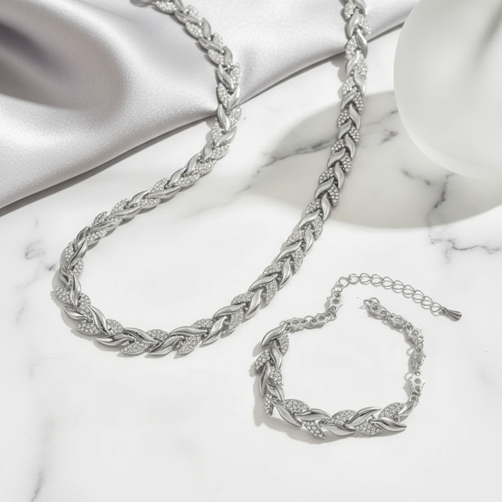 Un set rafinat format din colier și brățară, cu model împletit și accente strălucitoare, perfect pentru ținute elegante sau moderne de zi. O piesă statement care scoate în evidență feminitatea și stilul tău.