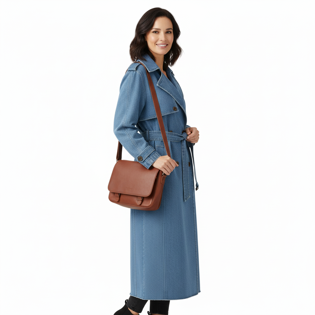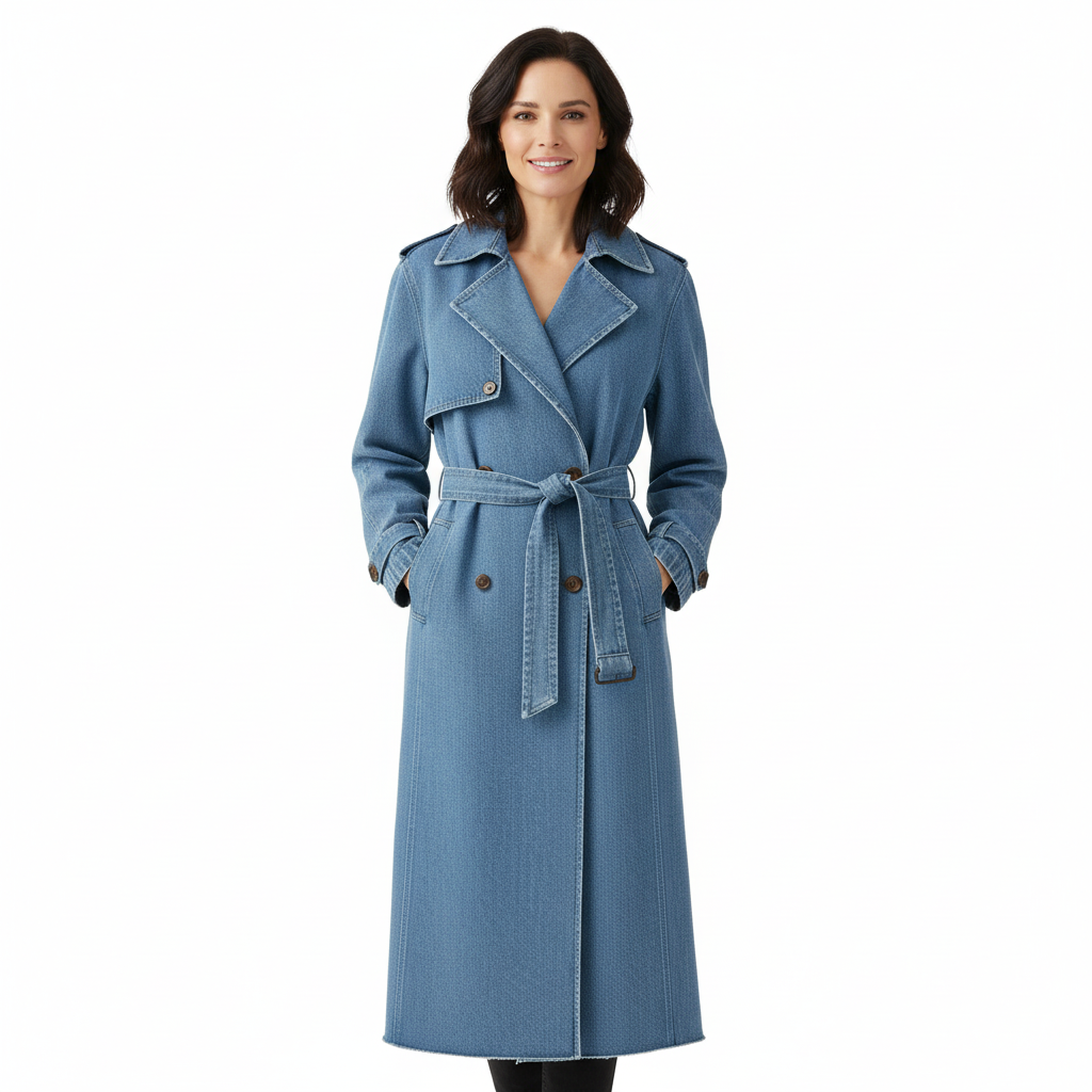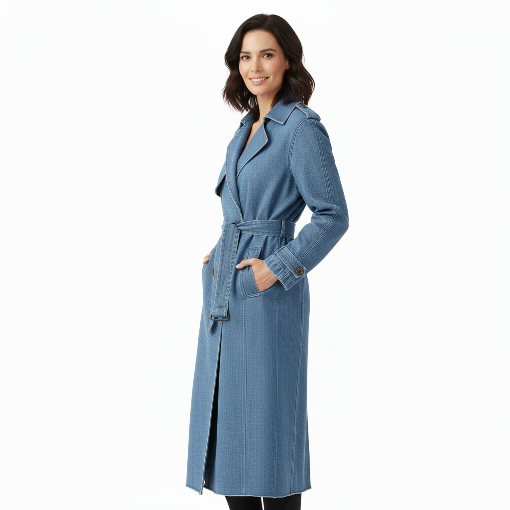 Creat din denim moale, cu o croială lungă și elegantă, acest trench te îmbracă într-o prezență calmă, modernă și impecabilă. Talia se ajustează cu un cordon feminin, iar detaliile clasice îi dau un aer atemporal.