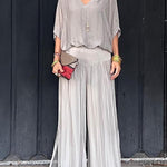 Setul Esmeralda Elegant din Chiffon aduce o eleganță aerisită garderobei tale de zi cu zi sau de seară. Construit din chiffon fluid, setul prezintă un top delicat drapat, asociat cu pantaloni largi cu talie înaltă pentru o siluetă sofisticată. Fie că participi la o petrecere de vară sau la o cină la apus, acest set radiază farmec fără efort și încredere rafinată.