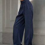 Design: Pantaloni de birou cu picior larg, sofisticati, cu un model clasic cu dungi, talie înaltă și pliuri croite pentru un aspect elegant. Silueta structurată emană eleganță atemporală.