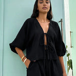 Design: Un set chic format din două piese, cu un top cu mâneci lungi, relaxat, și un detaliu elegant de legătură în față, asociat cu pantaloni scurți cu talie înaltă pentru un look coordonat fără efort. Designul minimalist combină confortul cu eleganța modernă.