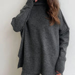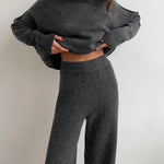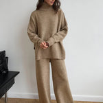 Design: Un set tricotat elegant și minimalist, care include un pulover confortabil cu guler înalt și pantaloni drepti asortați. Designul chic, fără efort, oferă o estetică rafinată și relaxată.