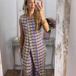 Costumul Comod Imprimat Skye de la Buvala oferă un stil fără efort și confort pe parcursul întregii zile. Conceput dintr-un material ușor și respirabil, acest set include un top lung relaxat și pantaloni largi asortați cu un imprimeu abstract atrăgător. Perfect pentru ieșiri însorite, plimbări pe plajă sau întâlniri relaxate la cafea.