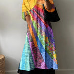 Adaugă o notă de artă și culoare garderobei tale cu această rochie frumoasă. Designul fluid și modelele vibrante creează un aspect rafinat, dar jucăuș.