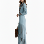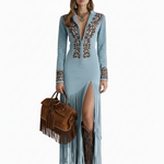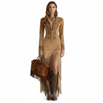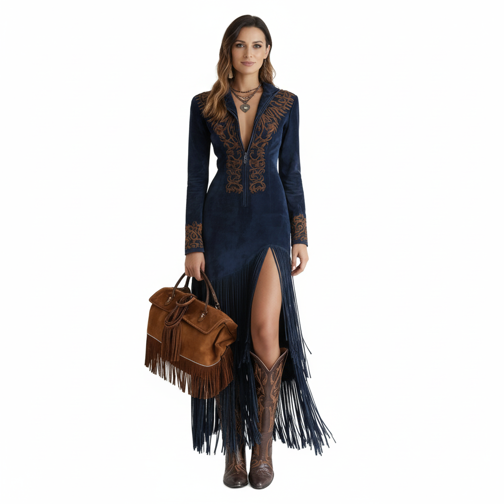 Rochia “Nelia” reinterpretează estetica western cu linii elegante, franjuri lungi și o broderie superbă în contrast. Croiala urmărește silueta, iar deschiderea frontală adaugă un aer irezistibil de seducător. Un model statement, creat pentru femeile care nu trec neobservate.