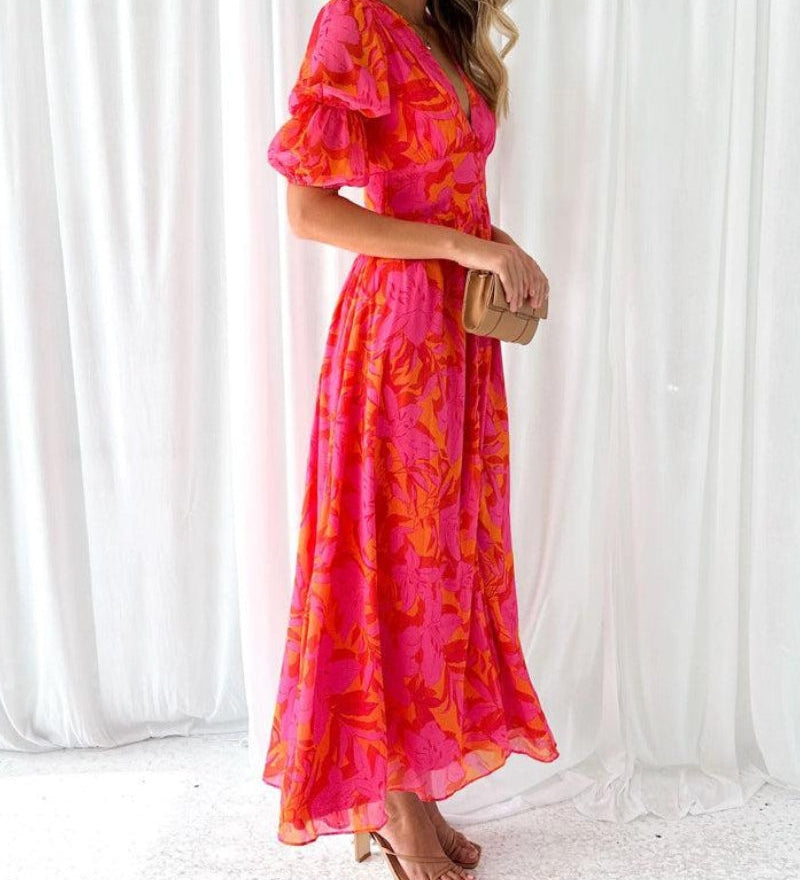 Zynelle | Rochie Maxi Elegantă cu Mâneci Puff și Decolteu în V