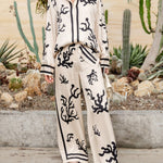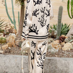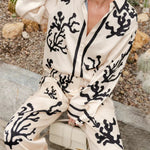 Setul de pijamale Emma combină perfect luxul și confortul. Fabricat din viscoză netedă ca mătasea, cu un finisaj strălucitor, oferă o senzație incredibil de moale pe piele. Imprimarea modernă neagră pe un fundal crem adaugă o notă contemporană acestui ansamblu elegant. Croiala relaxată și materialul fluid asigură libertate maximă de mișcare—perfect pentru a te relaxa acasă sau pentru a face o declarație stilată într-un resort.