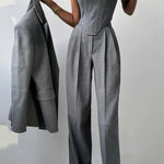 Setul Grace din Trei Piese îmbină fără efort sofisticarea clasică cu stilul contemporan. Dotat cu un sacou cu două rânduri de nasturi perfect croit, asociat cu pantaloni coordonați și un top asortat, acest set oferă un ansamblu elegant și armonios care atrage atenția. Ideal pentru întâlniri de afaceri, evenimente formale sau streetwear elegant, este o piesă versatilă care îți îmbunătățește garderoba.