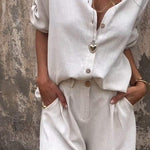 Setul Jolie din bumbac și in aduce un design atemporal și confort modern într-o ținută elegantă. Confecționat dintr-un amestec moale de bumbac și in și detaliat cu un rever structurat și cusături curate, acest set este alegerea ta pentru a arăta rafinat în timp ce rămâi răcoros. Indiferent dacă mergi la brunch, faci cumpărături sau te bucuri de o după-amiază relaxată, Jolie oferă echilibrul perfect între eleganță și confort.
