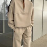 Design: Acest set include o jachetă cu guler și închidere cu fermoar, asociată cu pantaloni asortați, oferind un aspect coerent și stilat.