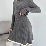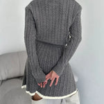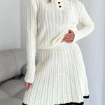 Design: Acest set are un design tricotat în cablu cu margini contrastante, inclusiv un top cu rever și o fustă asortată, oferind un look elegant și coordonat.