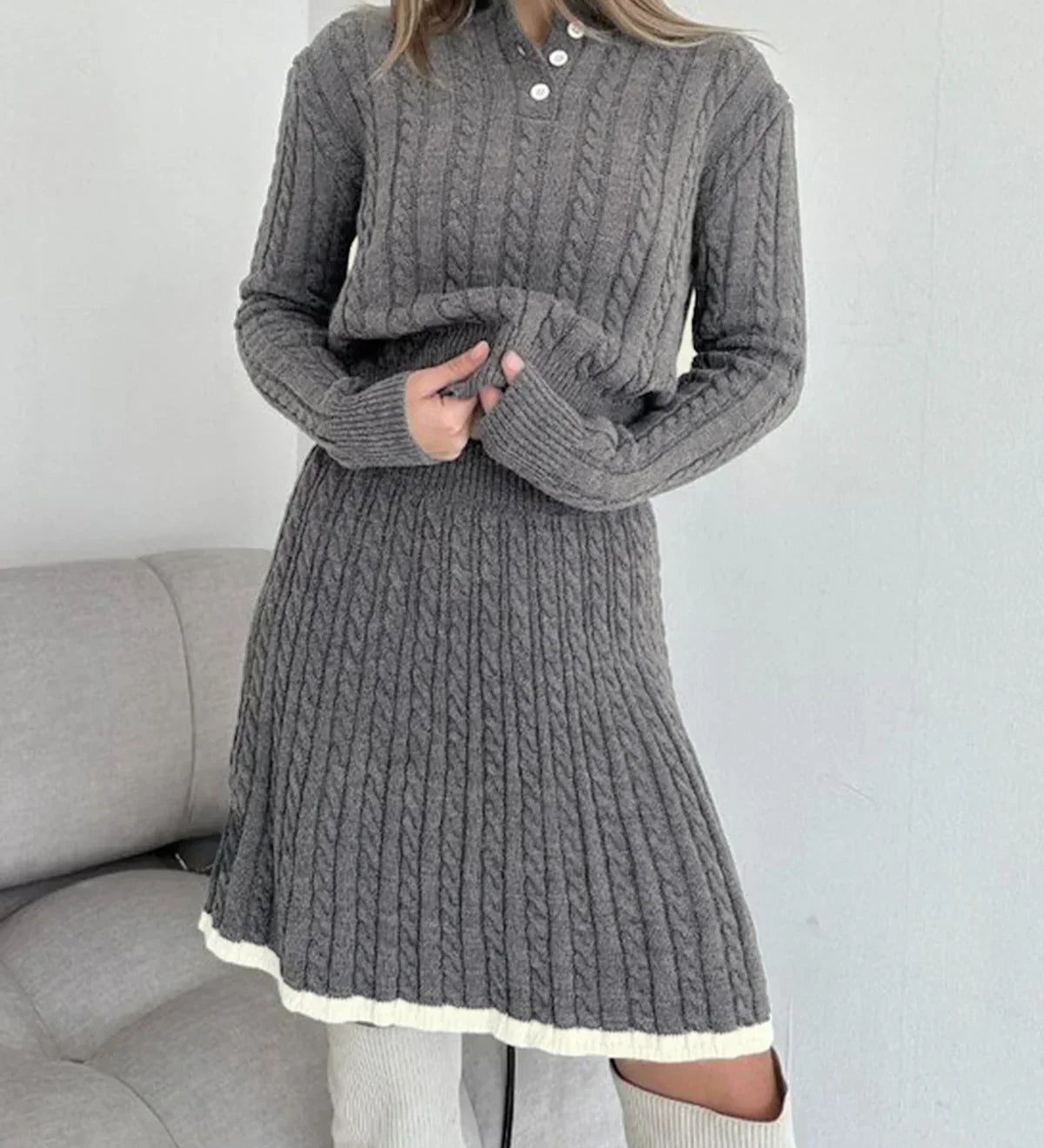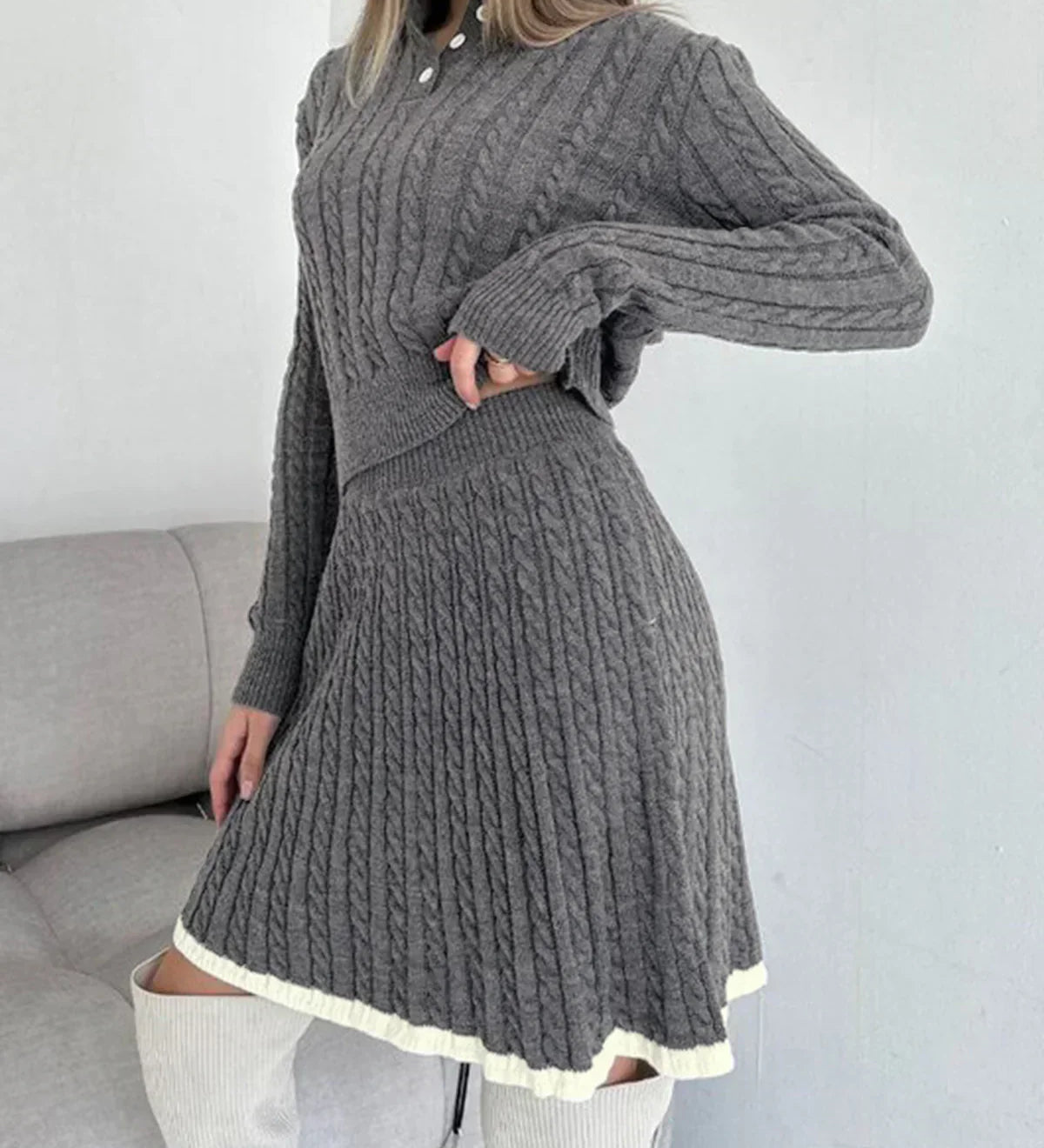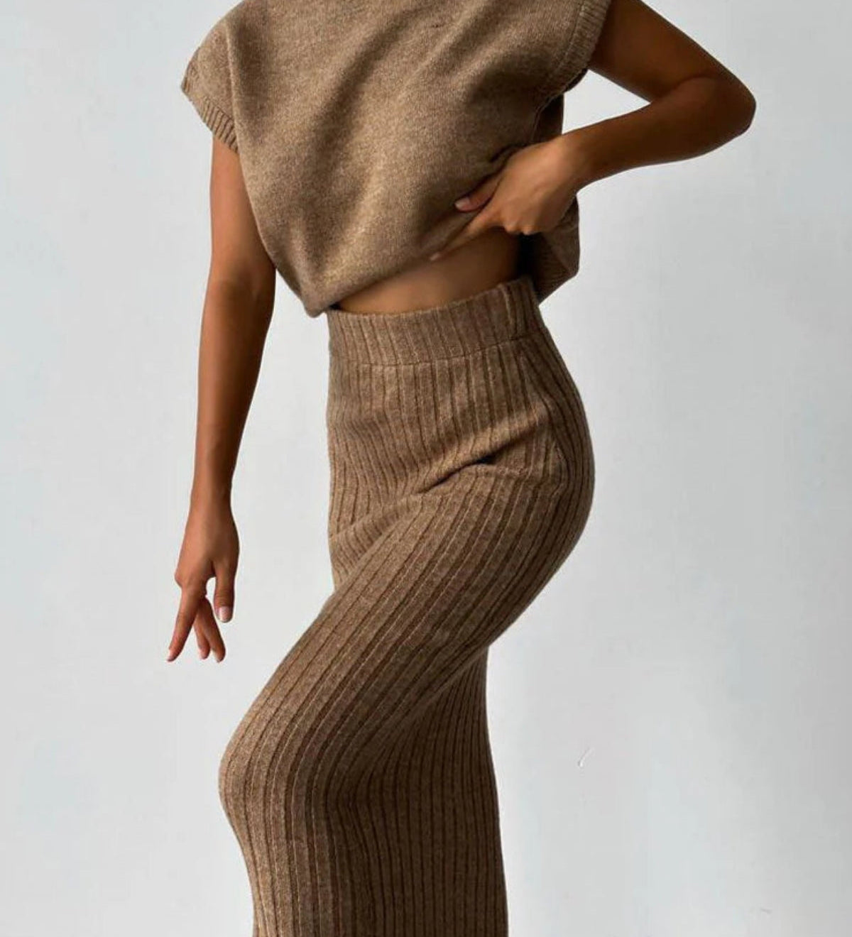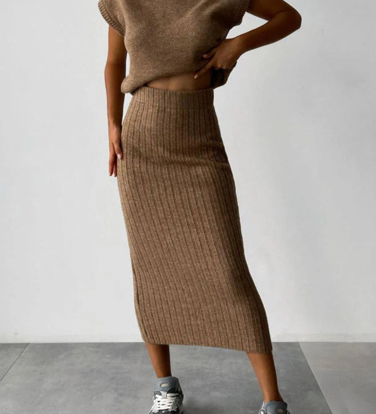 Set Asamblat: Top Tricotat Gros și Fustă Midi Tricotată cu Talie Înaltă