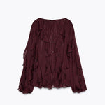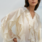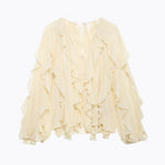 Bluza cu volane se distinge printr-un stil elegant și surprinzător, fiind o alegere ideală pentru a adăuga un plus de rafinament garderobei tale. Această piesă vestimentară este perfectă pentru diverse ocazii, oferind un confort deosebit datorită materialului său ușor și respirabil, care te va face să te simți bine pe tot parcursul zilei.