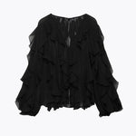 Cu o pasformă care îmbrățișează delicat silueta, bluza este accentuată de volane jucăușe, ce adaugă un element dinamic și feminin. Materialele de calitate superioară asigură nu doar un aspect elegant, ci și o funcționalitate sporită, fiind potrivită pentru activități cotidiene sau evenimente speciale. Detaliile atent concepute permit o libertate de mișcare, făcând-o o alegere practică și stilată.