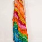 Fă o impresie uimitoare cu rochia Iris cu volane, având volane în cascadă și un imprimeu vibrant tie-dye. Confecționată dintr-un crep georgette moale, această rochie oferă o senzație luxoasă și eleganță fără efort, perfectă pentru ocazii speciale în care vrei să te evidențiezi.